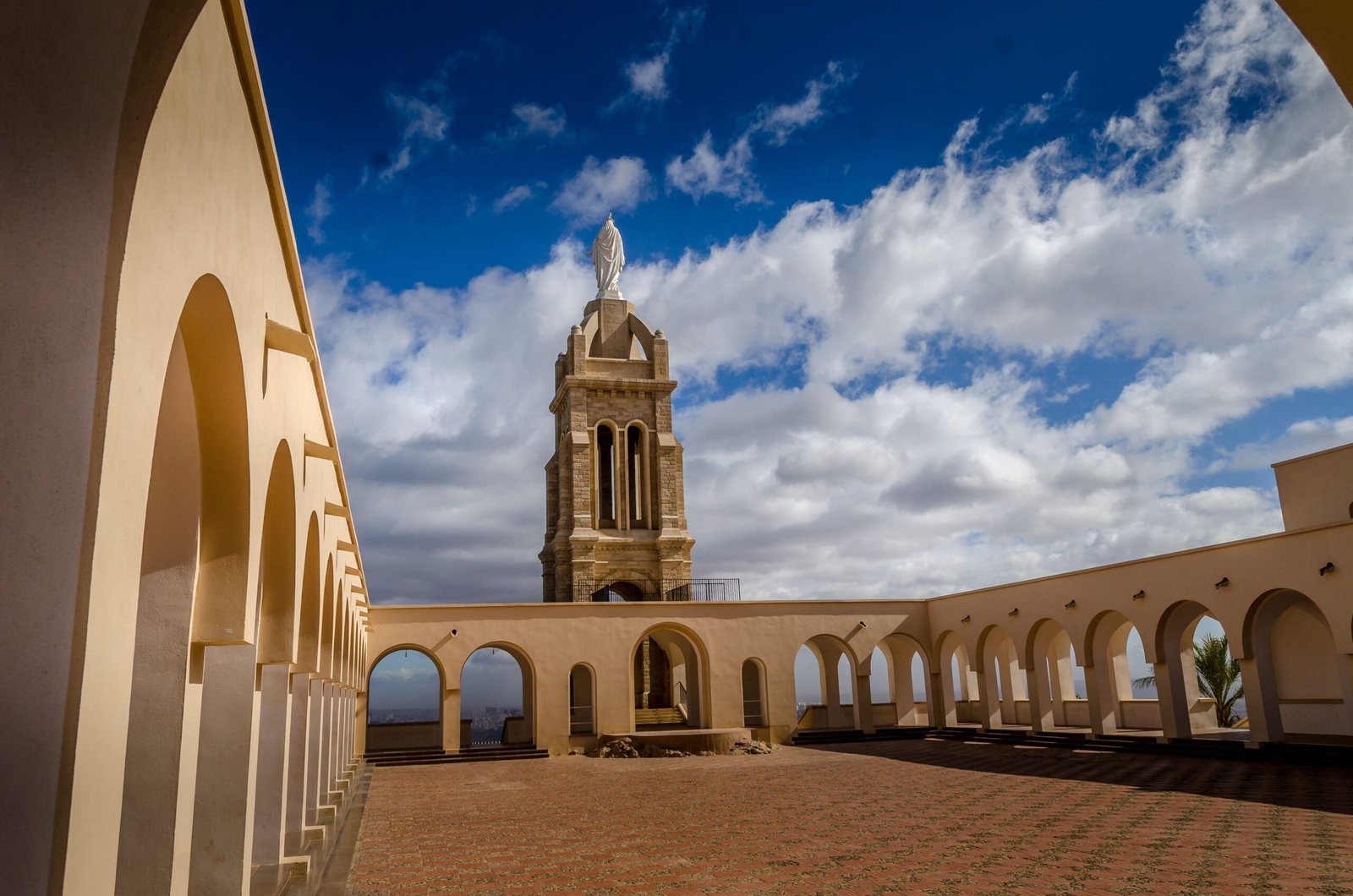 Véritable sentinelle blanche dominant la baie, la Chapelle de Santa Cruz est sans doute le monument le plus emblématique de l’âme oranaise. Érigée en 1850 pour remercier la Vierge d’avoir épargné la ville d’une terrible épidémie de choléra, elle se dresse juste en contrebas de la forteresse espagnole. Sa silhouette immaculée, couronnée d’une statue monumentale, semble veiller sur le port de Mers El-Kébir et l’horizon azur. C’est un arrêt incontournable : l’esplanade offre une sérénité absolue et le panorama le plus spectaculaire de la ville, particulièrement prisé au coucher du soleil.